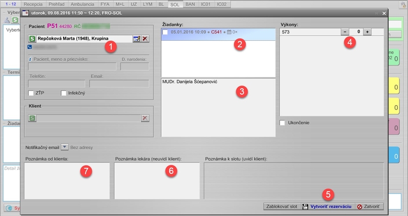 Kliknutím na tlačidlo rezervovať sa otvorí rezervačný formulár na termín v daný čas. Pokiaľ sme mali pri otvorení kalendára obsadenosti vybraného pacienta, tento pacient bude v rezervačnom formulári predvyplnený.