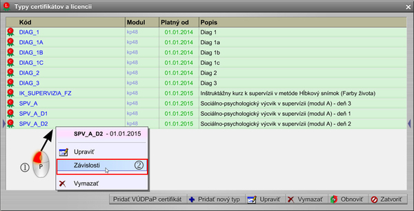 Aby sme vytvorili takúto závislosť, vytvoríme oba certifikáty a v zozname certifikátov podržíme ľavé tlačidlo myši nad certifikátom, ktorého závislosti ideme vytvoriť obrázok 4 - 1. V zobrazenom kontextovom menu zvolíme možnosť Závislosti obrázok 4 - 2.