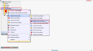 Technológia sa vytvára v hlavnej štruktúre tak, že sa vytvorí v adresári pre uloženie technológií. Podržaním ľavého tlačidla myši nad týmto adresárom sa otvára kontextové menu. V menu zvolíte Vytvoriť novú položku ⇒ Vytvoriť novú technológiu.