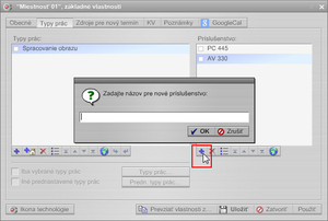 Pri rozličných typov prác môžeme využívať či potrebovať rôzne príslušenstvo. To môžeme pridať pre technológiu v záložke Typy prác v zozname príslušenstva, stlačením tlačidla . Následne v dialógovom okne zadáme meno príslušenstva.